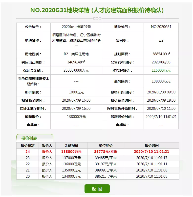(5)地块竞价达到较高限价时停止竞价,改为在本地块内竞争人才房建筑面积,面积最多者竞得。人才房建成后无偿移交江宁区政府。