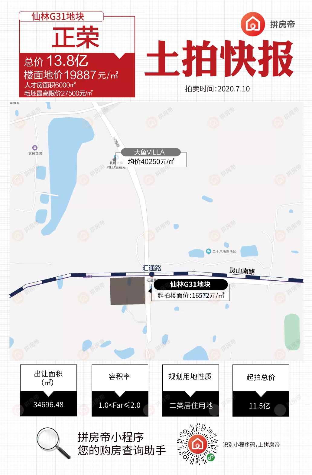 4、据消息,仙林G31地块25家房企报名!G31地块紧邻复地大鱼VILLA,但容积率2.0,不是低密住宅,该地块毛坯房较高限价2.75万/平,未来加上精装价格或许要比大鱼便宜不少。网传报名房企:新城、禹洲、龙湖、路劲、融信、华侨城、绿都、招商、栖霞、金地、保利,先进、大发、中南、碧桂园、东原、新希望、正荣、金茂、旭辉+银城、中海等。