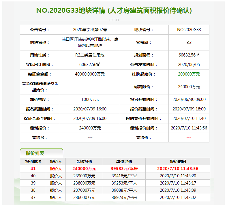 5、江北G33地块经过58轮竞价,被杭州滨江拿下,成交楼面地价19791元/平,需建人才房面积3400平,未来毛坯房较高限价28000元/㎡。
