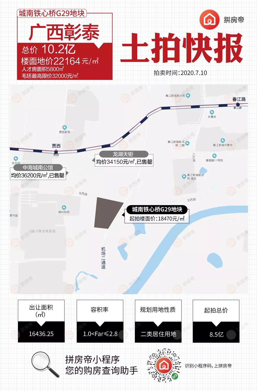 1、铁心桥G29地块经过47轮竞价被广西彰泰拿下,成交楼面价22164元/平,需建人才房面积5800平,未来毛坯房较高限价32000元/㎡。