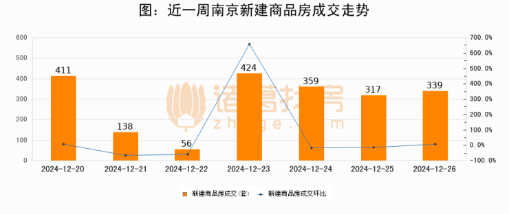根据南京市住房保障和房产局数据显示,2024年12月26日南京新建商品房成交339套,较昨日增加22套,环比上涨6.9%。近一周南京新建商品房日均成交292套。12月26日单日成交339套,高于近一周平均水平16.1%。