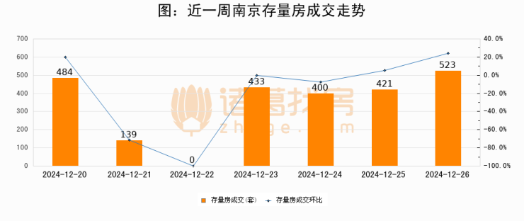 从存量房来看,2024年12月26日南京存量房单日成交523套,比昨日增加102套,环比上涨24.2%。从近一周存量房成交来看,南京存量房日均成交套数为342套,12月26日单日成交523套,高于近一周平均水平52.9%。