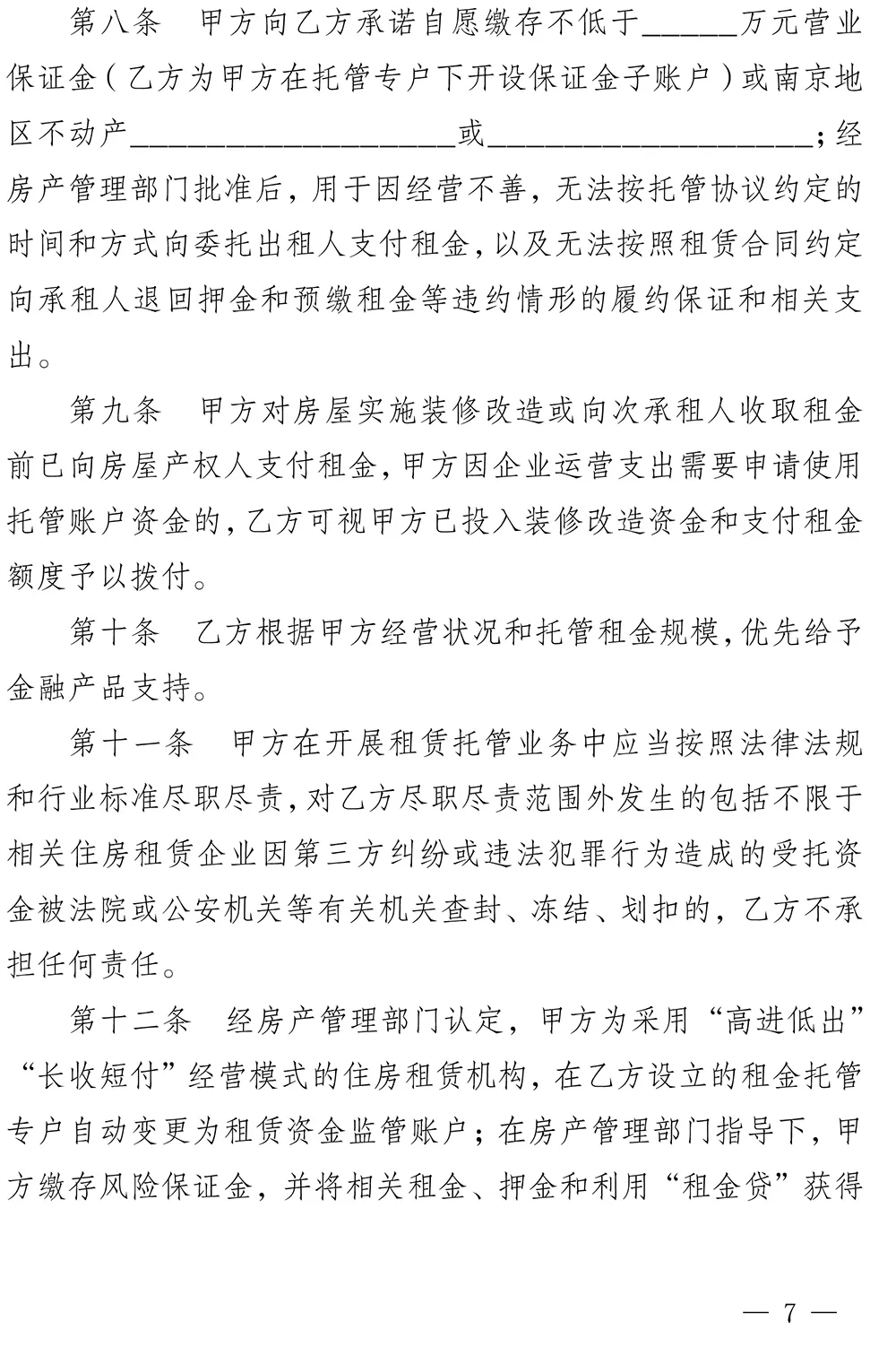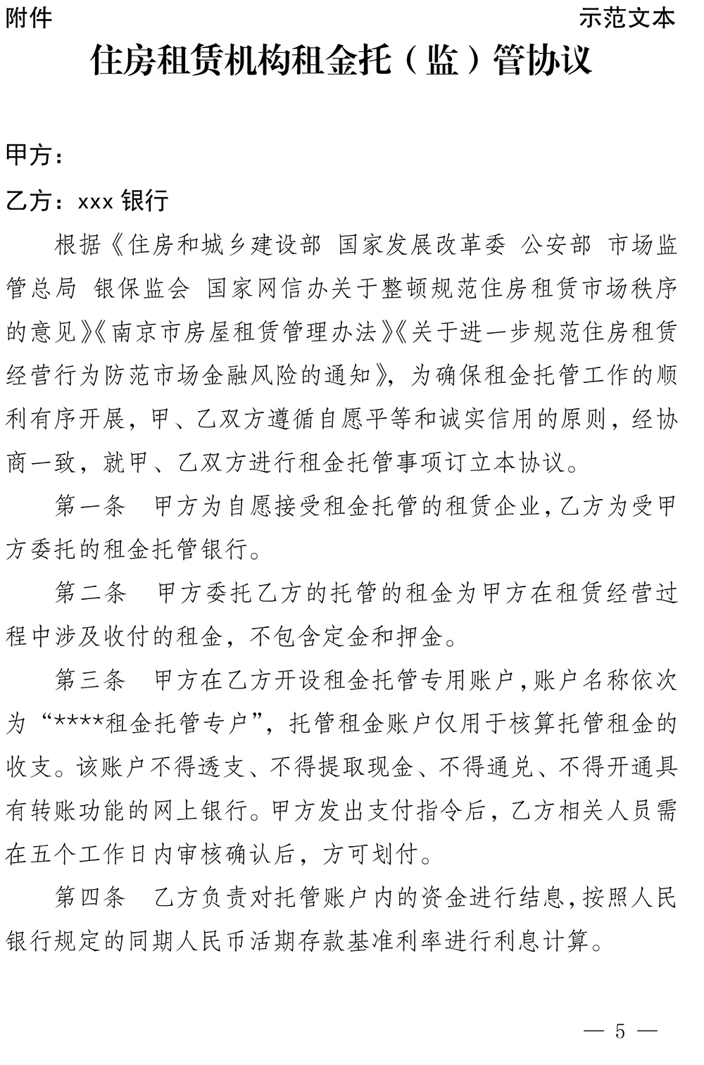 为了保护租赁当事人的合法权益,规范住房租赁经营行为,根据《南京市房屋租赁管理办法》《关于整顿规范住房租赁市场秩序的意见》《关于进一步规范住房租赁经营行为防范市场金融风险的通知》等文件精神,现就我市行政区域内从事住房租赁经营活动的企业、个体工商户(以下简称“住房租赁机构”)建立租金托管制度等有关事项通知如下: