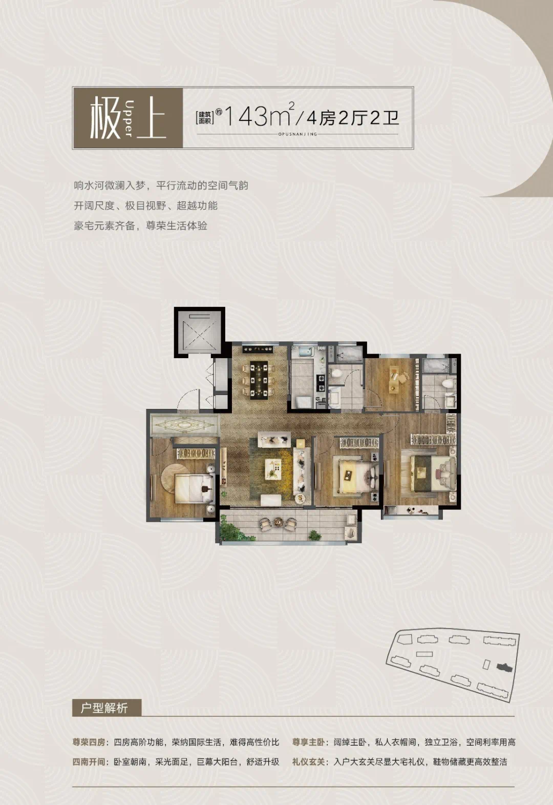 在外观设计上,华著兰庭以“世界风、中国华”的美学注脚将东方神韵融入到建筑立面、景观设计、室内精装上,再配以现代工艺及材质,让摩登技艺融合,是为艺制。
