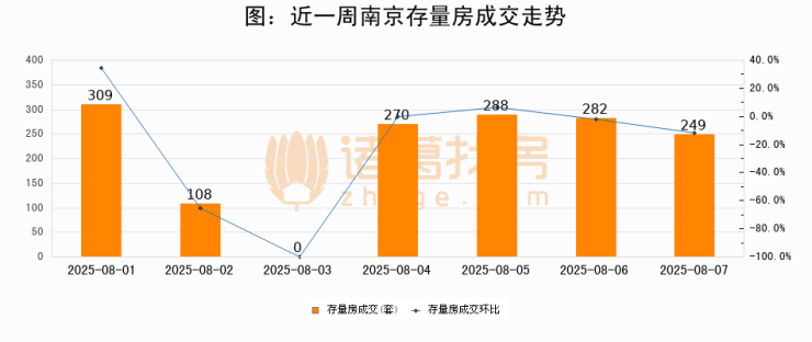 从存量房来看,2025年08月07日南京存量房单日成交249套,比昨日减少33套,环比下降11.7%。从近一周存量房成交来看,南京存量房日均成交套数为215套,08月07日单日成交249套,高于近一周平均水平15.8%。