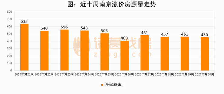 从调价房源来看,第30周南京涨价房源450套,较上周下降2.4%。与此同时,30周涨价房源占比回落0.13个百分点,业主信心小幅波动,购房者可则需入市。