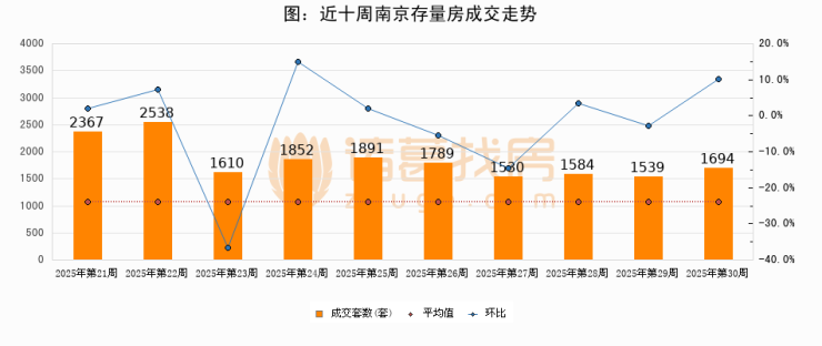 存量房方面,第30周南京存量房成交1694套,较上周增加155套,环比上涨10.1%。从近十周成交走势来看,周均成交套数为1839套,本周低于平均水平7.9%。