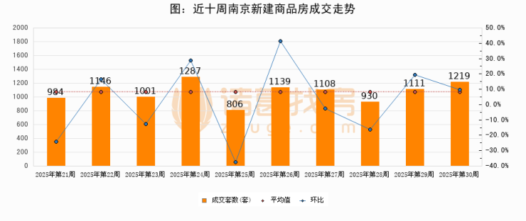 进入2025年第30周(07月21日-07月27日),南京新建商品房成交1219套,较上周增加108套,环比上涨9.7%。从近十周成交来看,周均成交套数为1073套,本周成交1219套,高于近十周平均成交量13.6%。