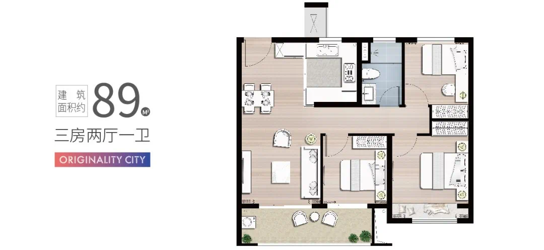建面约89㎡:三房两厅一卫,整个户型非常方正,客厅与朝南卧室为双阳台设计,另外一个朝南卧室则为飘窗的设计,整个户型做到了动静分离,空间利用率极高。