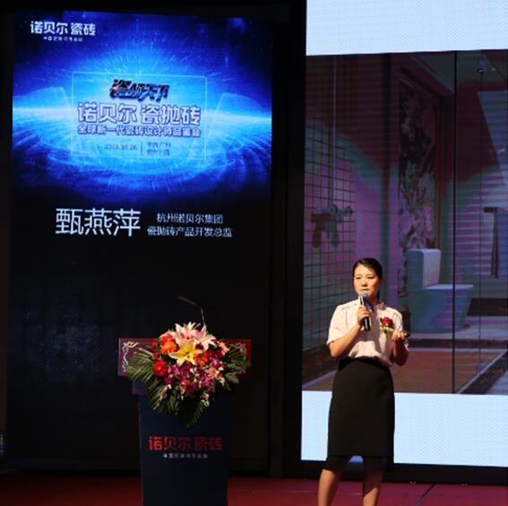 总部研发部经理甄燕萍女士对全球新一代瓷砖——诺贝尔瓷抛砖进行了详细的产品介绍:瓷抛砖从技术上实现了四大核心突破:瓷质装饰面材技术、数码喷墨渗透技术、多维通体布料技术和微米级表面处理工艺。瓷抛砖作为新一代瓷砖的五大特点:以新型瓷面替代传统釉面,以立体渗花替代平面印花,结合多维通体布料技术和微米级表面处理工艺,实现了表面更耐磨、花纹更逼真、质感更通体、质地更厚实、触感更温润。