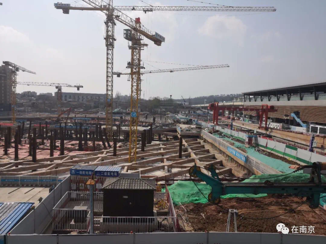 不管如何,与复地三期仍是一片宁静的菜地风光相比,隔着地铁站相望的中垠紫金城市广场(换乘中心)在三月复工后,如今已干得热火朝天。现场看,与2号线站房并排而立的S6宁句线站房“底部基座”已初步成型。这,确实足够让人惊喜。