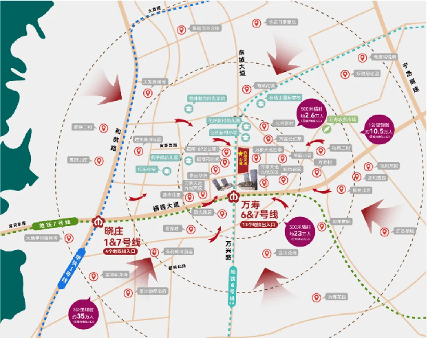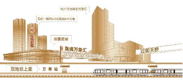 万象天地公寓是真正的地铁上盖产品,位于 6、7 号线双地铁接驳的万寿站,双地铁接驳,未来9站即可到达新街口。