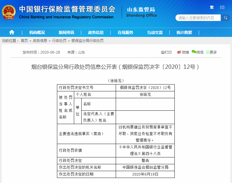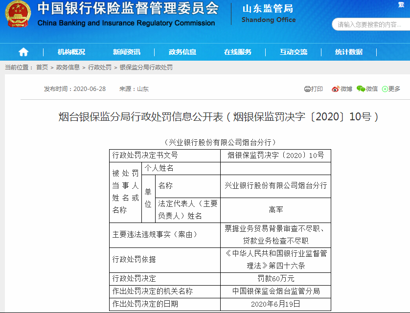 原标题:《兴业银行烟台分行被罚60万,因存在贷款业务检查不尽职等违法违规事实 》