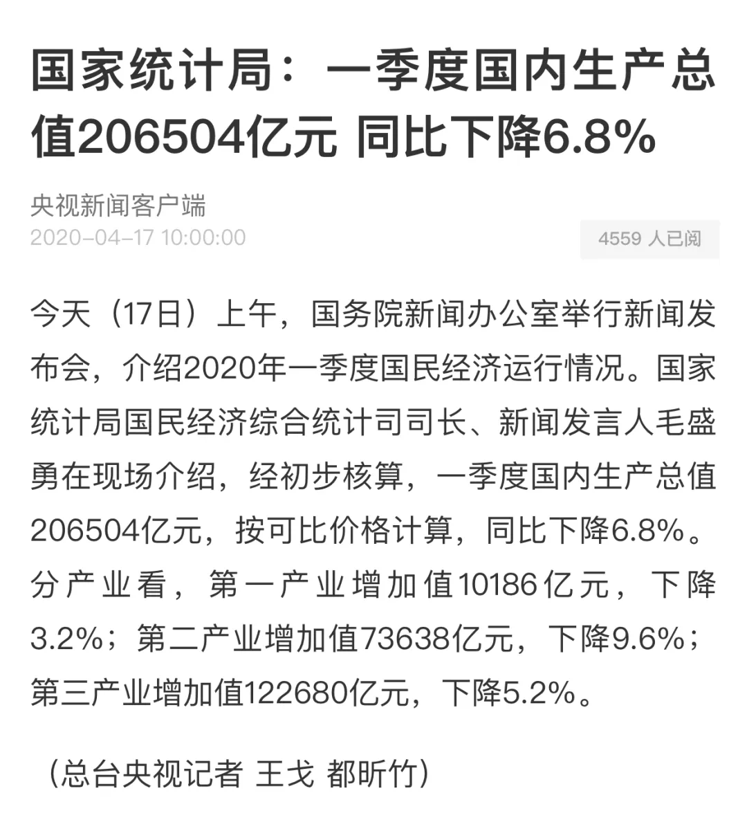 今天(17日)上午,国务院新闻办公室举行新闻发布会,介绍2020年一季度国民经济运行情况。国家统计局国民经济综合统计司司长、新闻发言人毛盛勇在现场介绍,经初步核算,一季度国内生产总值206504亿元,按可比价格计算,同比下降6.8%。分产业看,排名前列产业增加值10186亿元,下降3.2%;第二产业增加值73638亿元,下降9.6%;第三产业增加值122680亿元,下降5.2%。