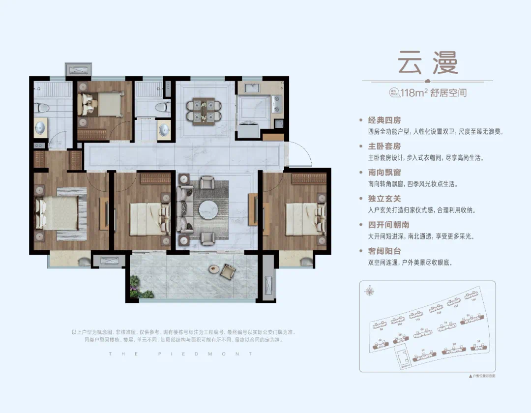 “这个户型层高接近3米,经典四房设计,4开间朝南,大开间短进深,南北通透。拥有独立入户玄关,南向转角飘窗较大化收纳中心景观,主卧室采用套房设计,要穿过步入式衣帽间才能进入洗手间。还有,你们现在站的南向景观阳台,总长度有5.8米。几乎赶上大平层阳台的标准了。”置业顾问小哥一口气连珠炮似的絮絮叨叨。