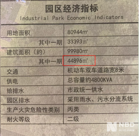 另据《每日经济新闻》记者在该园区招商中心获取的《招商手册》,该产业园一期的总建筑面积为44896㎡,除去门卫、垃圾房和消防泵房后共44636.34㎡,与《每日经济新闻》记者在园区一期内用工具测量和计算得出的总建面相差无几。