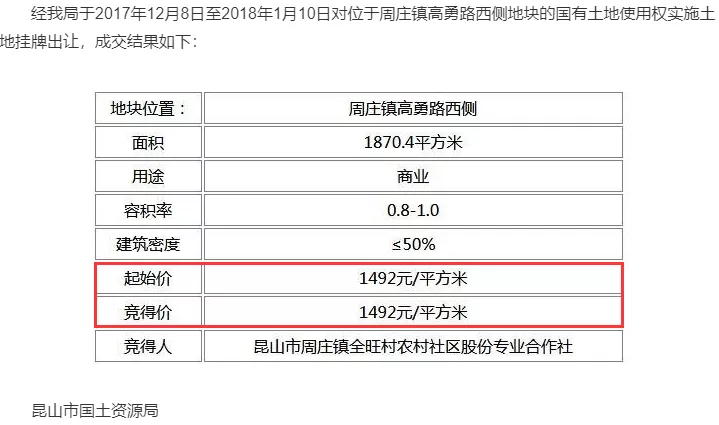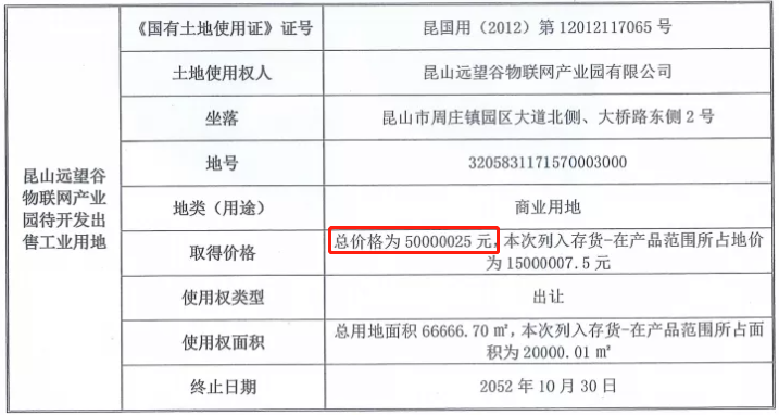 《每日经济新闻》记者还注意到,2017年12月28日,在距离昆山远望谷2公里的地方,昆山市拍出一块商服用地(昆地网[2017]挂字13号),于2018年1月10日成交。该地块位于周庄镇高勇路西侧,土地面积1870.4㎡,容积率0.8~1.0,价格为279万元,楼面地价为1492元/㎡,较远望谷评估的2号地楼面地价多172元/㎡。如果说两年前拍卖的土地价格是合理的,在物价和地价不断上涨的2年后,位置相近的远望谷2号地土地(智慧文旅商业园)评估价格是否公允就很值得推敲了。