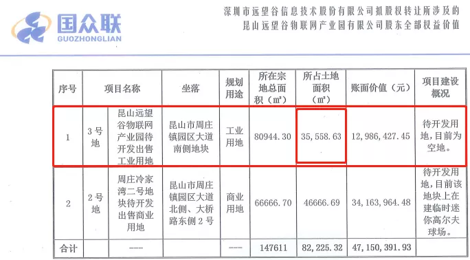 具体来看,在远望谷2019年6月12日公布的评估报告中,国众联对“3号地昆山远望谷物联网产业园待开发出售工业用地”评估的所占土地面积为35558.63㎡,对应账面价值为1298.6万元。然而,在远望谷2019年6月28日公告的对深交所问询函的回复中却称,“3号地昆山远望谷物联网产业园待开发出售工业用地”的评估土地面积为19046.91㎡,两者相差16511.72㎡。