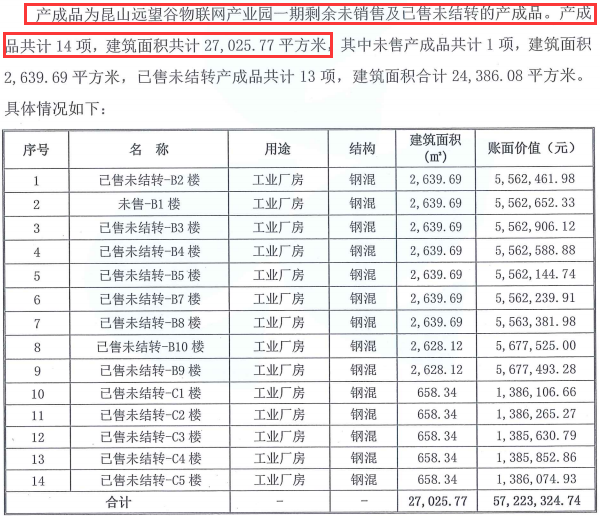 在2019年6月28日远望谷对深交所问询函的回复函中,标的资产物联网产业园一期剩余未销售和已售未结转产成品共计14项,建筑面积共计27025.77㎡,总价为1.145亿元。