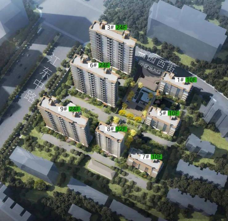 根据规划,项目将打造7栋10-24F住宅以及相关配套设施,其中,西侧3栋楼为24F,东侧3栋楼为10F,中间还有1栋22F的景观楼王。