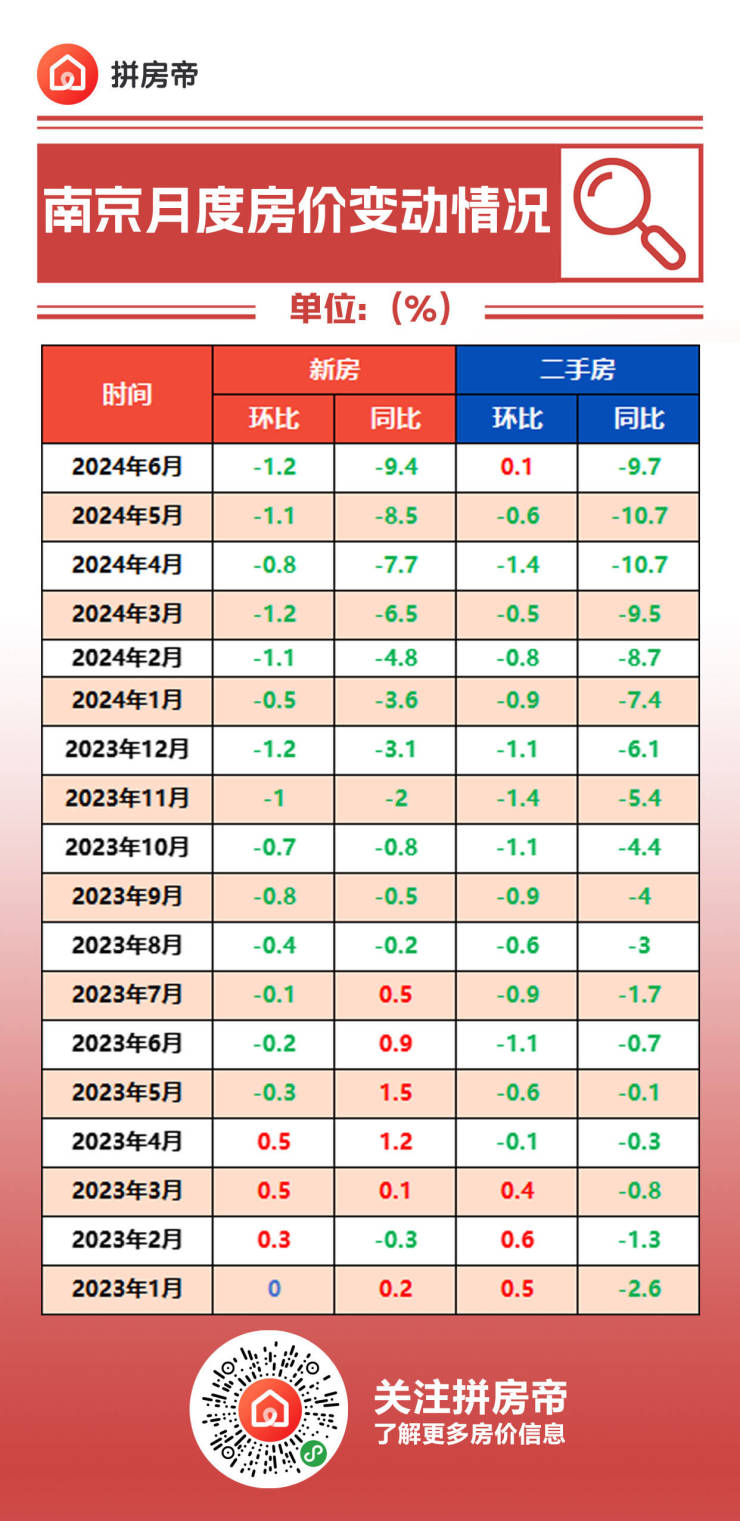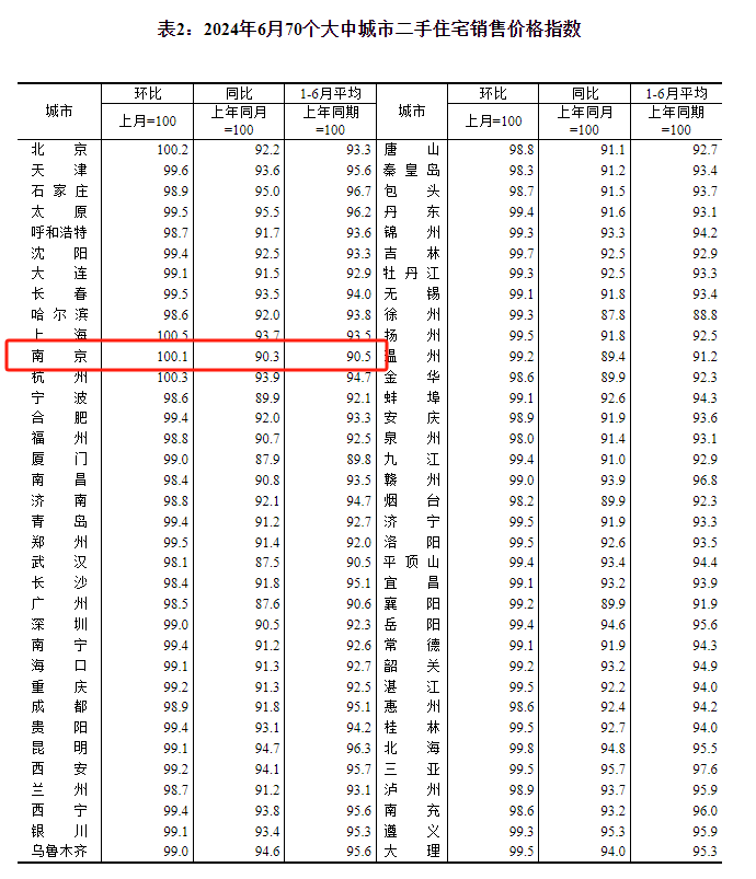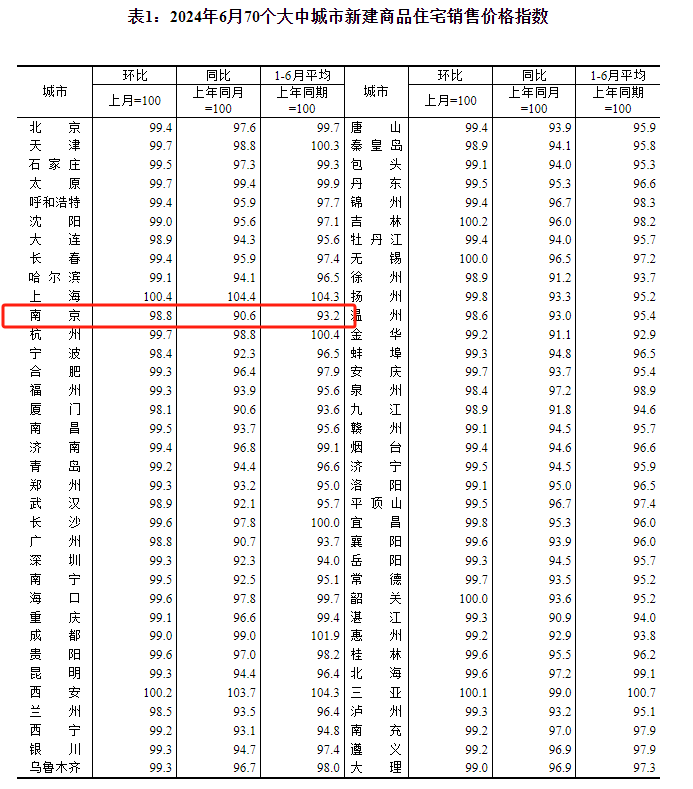 今天上午,国家统计局最新发布了2024年6月份70个大中城市商品住宅销售价格变动情况统计数据。其中,6月南京新房价格环比下跌1.2%、同比下跌9.4%,二手房价格环比上涨0.1%,同比下跌9.7%。