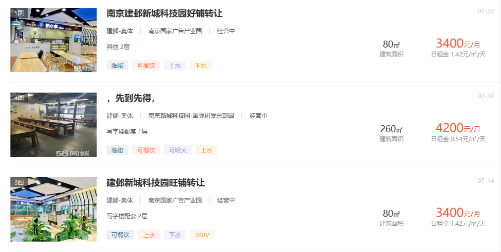 从58同城网上挂出的商铺转让信息来看,这些门店的运营业态基本上都是餐饮类,面积不大,一般面积在30㎡左右的租金,在8000多元/月。