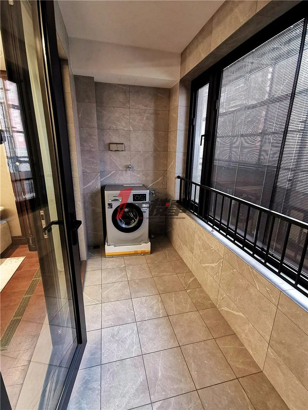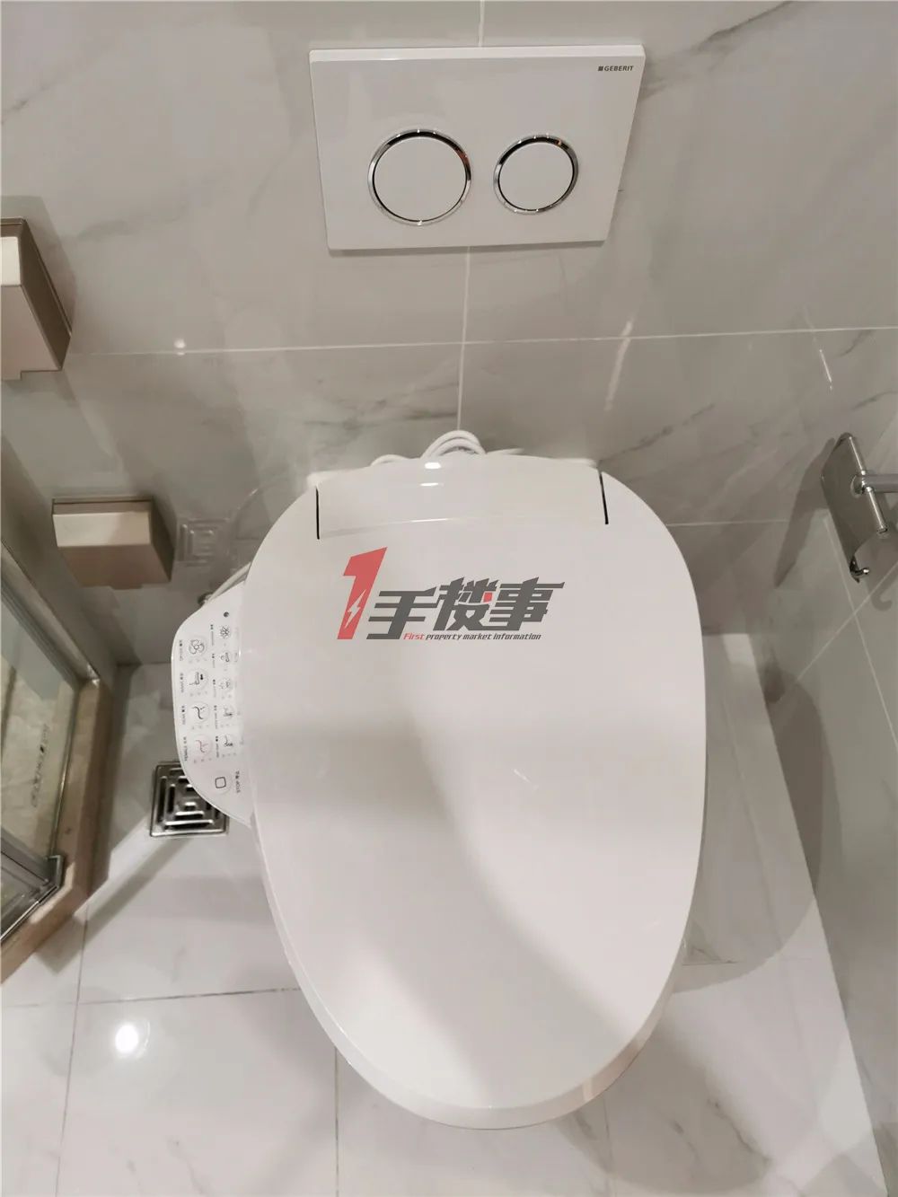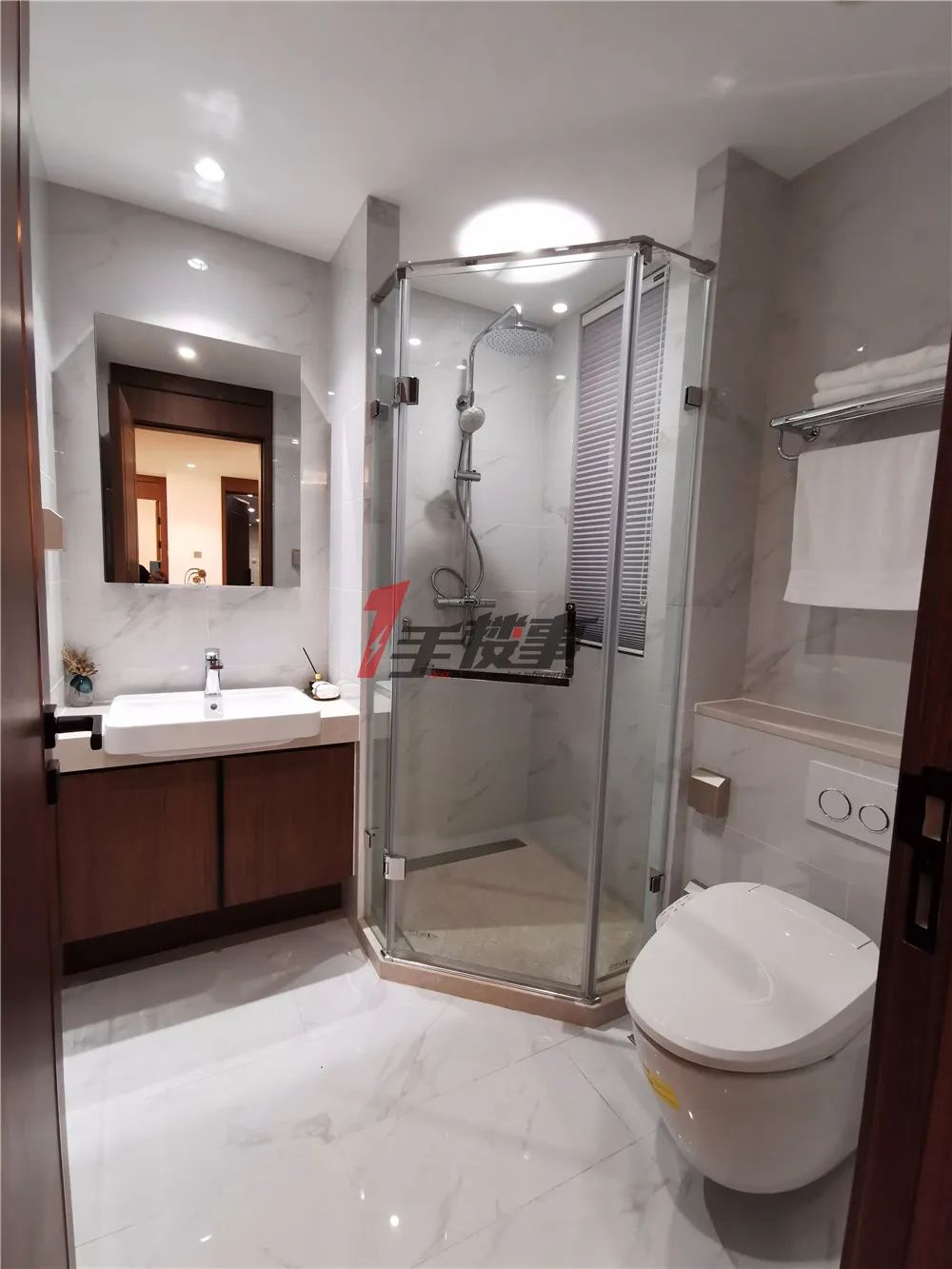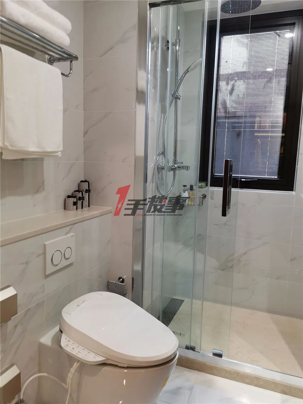 卫生间的地砖和墙面都是白底墨纹瓷砖,内置洗漱台、化妆镜、全自动自动马桶、淋浴隔断等。