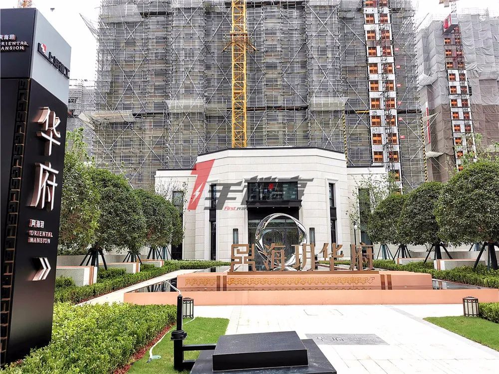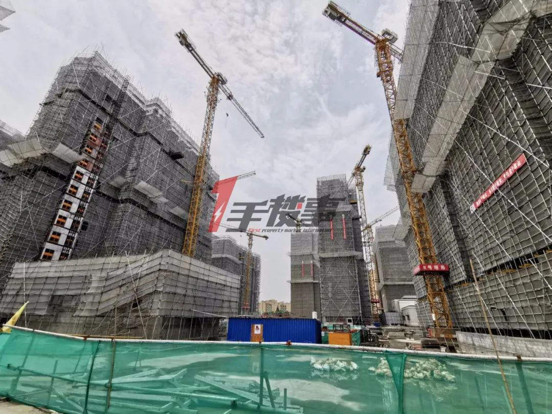 工地上,目前大部分楼栋已经封顶,楼栋均为18层且间距都比较大,采光效果上佳。另外,建筑被滤网罩住,远远看去,干净整洁,符合精工产品格调。