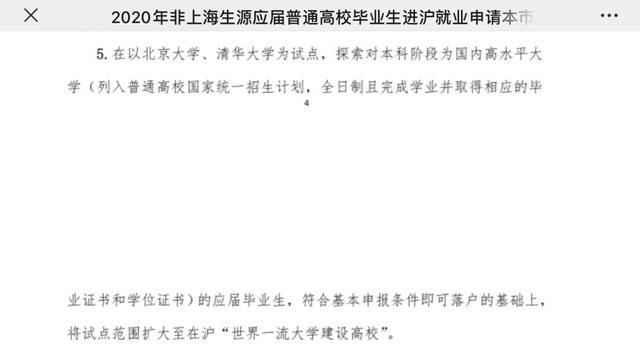 在办法中明确提出,将之前“以北京大学、清华大学为试点,探索建立对本科阶段为国内高水平大学的应届毕业生,符合基本申报条件可直接落户”的政策,范围扩大至在沪“世界一流大学建设高校”。