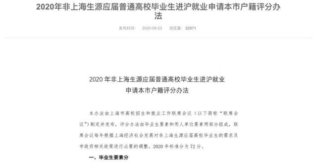 9月23日,《2020年非上海生源应届普通高校毕业生进沪就业申请本市户籍评分办法》正式发布。