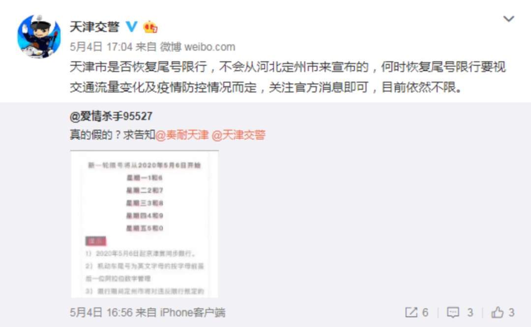 随着4月30日零时起,北京、天津一级响应调整为二级,人们越来越关心的一个问题是:何时恢复限行?甚至网上有“新一轮尾号限行将从5月6日开始“的图片流传。
