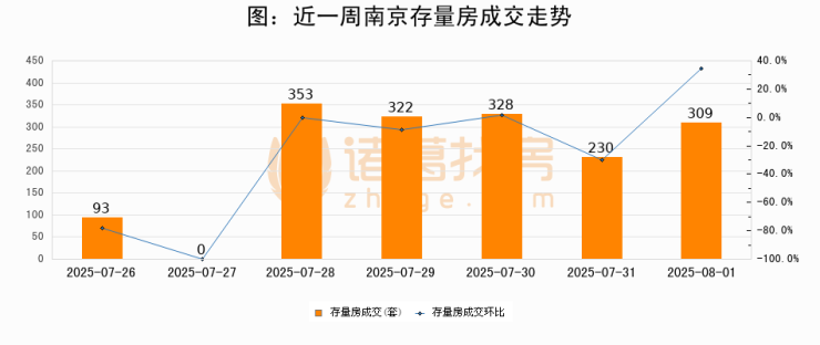 从存量房来看,2025年08月01日南京存量房单日成交309套,比昨日增加79套,环比上涨34.4%。从近一周存量房成交来看,南京存量房日均成交套数为233套,08月01日单日成交309套,高于近一周平均水平32.6%。