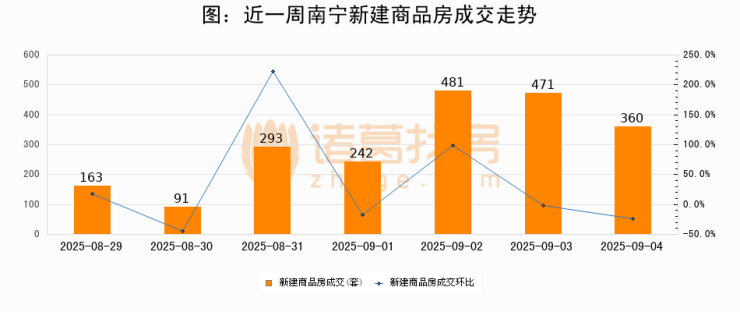 根据南宁市住房和城乡建设局数据显示,2025年09月04日南宁新建商品房成交360套,较昨日减少111套,环比下降23.6%。近一周南宁新建商品房日均成交301套。09月04日单日成交360套,高于近一周平均水平19.6%。