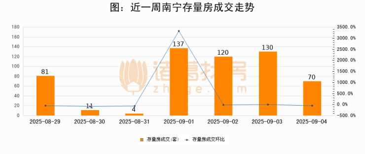 从存量房来看,2025年09月04日南宁存量房单日成交70套,比昨日减少60套,环比下降46.2%。从近一周存量房成交来看,南宁存量房日均成交套数为79套,09月04日单日成交70套,低于近一周平均水平11.4%。