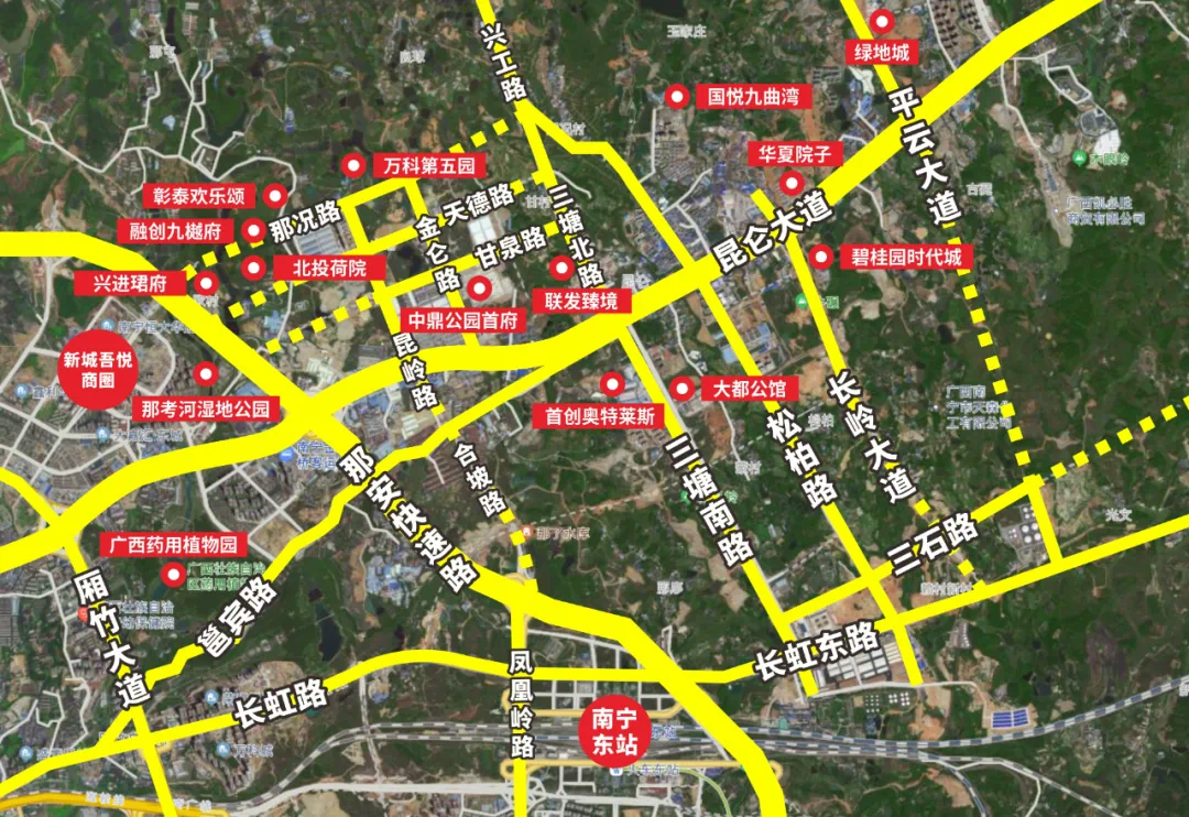 丨甘泉路已通车以前,三塘板块至火车东站的道路绕来绕去,加上堵车,居民出行很不便利。如今板块内部分路段相继通车之后,不仅通行时间缩短一大半,与万象城、会展航洋城、青秀万达广场等商圈的距离也大大拉近。此外,邕宾立交、邕武路立交、昆岭立交等立交也都在改善或建设中,预计一两年内均能实现通车。未来加上在建或待建道路建成通车后,兴宁东与凤岭的“隔阂”将被全面打通。