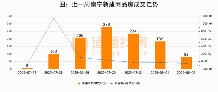 根据南宁市住房和城乡建设局数据显示,2025年08月02日南宁新建商品房成交81套,较昨日减少101套,环比下降55.5%。近一周南宁新建商品房日均成交156套。08月02日单日成交81套,低于近一周平均水平48.1%。