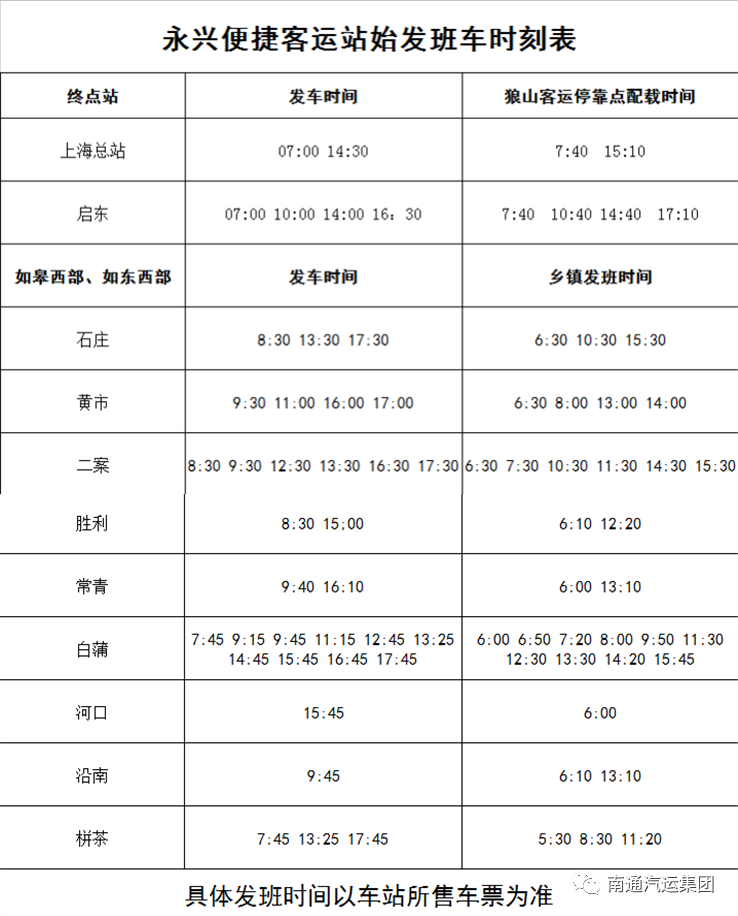 南通汽车客运站关停后,为了防止部分旅客“扑空”,南通汽运集团在南通汽车站至永兴站之间开行免费短驳车,每天早上6点半至下午5点,每半小时一班运送旅客,具体时间为9月19日至9月26日。