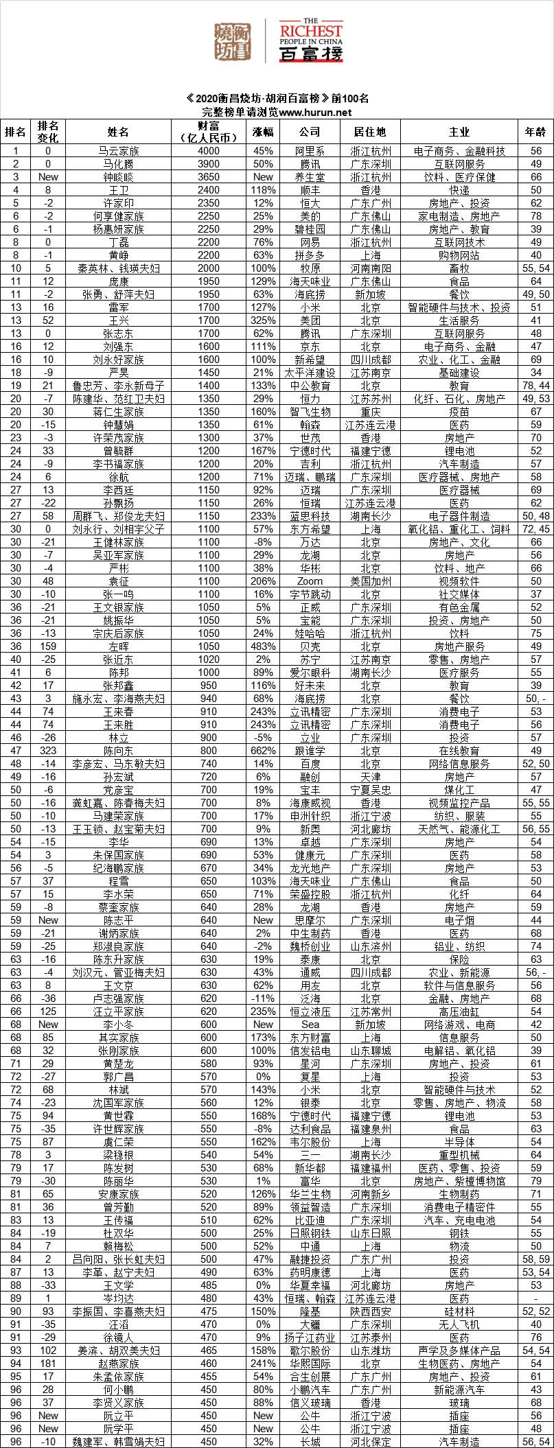 56 岁的马云财富增长 1250 亿,以 4000 亿元第四次登顶中国首富;49 岁的马化腾财富增长 1300 亿,以 3900 亿元位列第二。