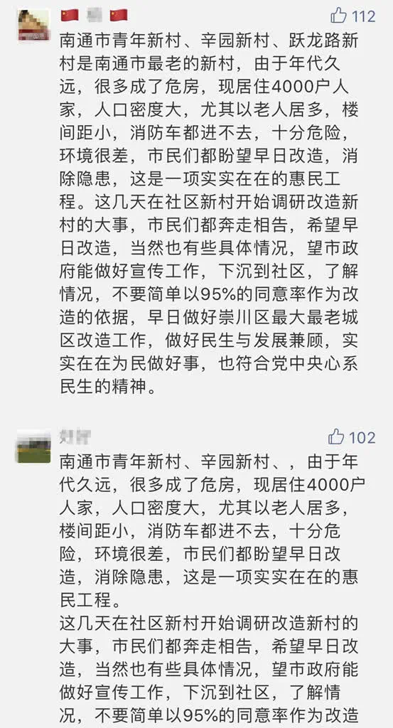 崇川区常务副区长谭真回应,以往的政策并不适用于目前这些小区的城市更新,本着“政府组织、居民自愿、市场运作、资金平衡、环境改善”的原则,居民意愿率是一个前提,旨在“共建共享共治”,“95%的同意率”是不会变的。
