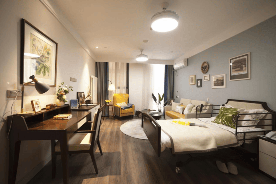 老人房间设施:护理床、呼叫器、储物柜、床头灯、电视、空调、冰箱、电话、独立卫生间、热水器、洗衣机、采暖、新风系统、智能监测设备、书桌