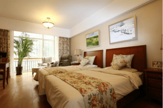 老人房间设施:护理床、呼叫器、储物柜、床头灯、电视、空调、冰箱、电话、独立卫生间、热水器、洗衣机、采暖、新风系统、智能监测设备、书桌