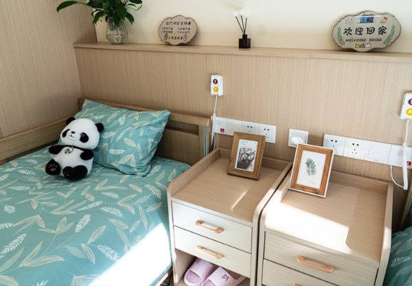 ▷ 设施配置 | □ 规模:普亲长辛店老年养护中心建筑面积4000平米,配备电梯门禁、24小时监控、智能护理床、一键呼叫系统;□ 安全细节:卧室家具无尖角、适配轮椅使用,防滑静音地胶;□ 配套设施:康复训练设备、老年娱乐健脑器材,24小时中央热水。