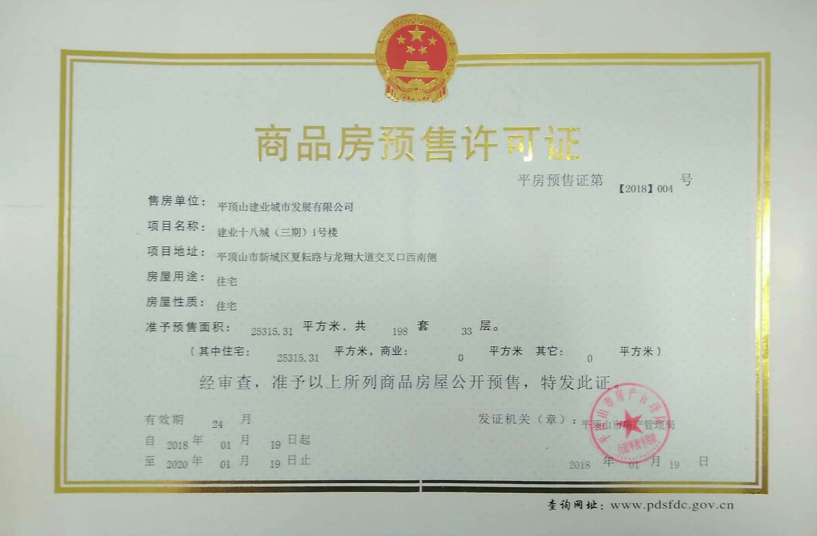 - 平房预售证第【2020】039号 详情发证时间 2020-04-27绑定楼栋建业十八城(四期)B-1号楼证件照片