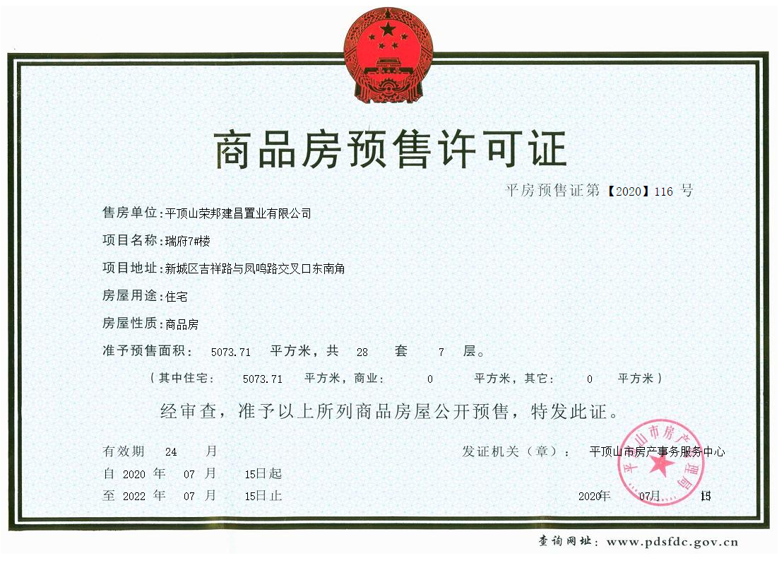 - 平房预售证第【2020】116号 详情发证时间 2020-07-15绑定楼栋瑞府7#楼证件照片