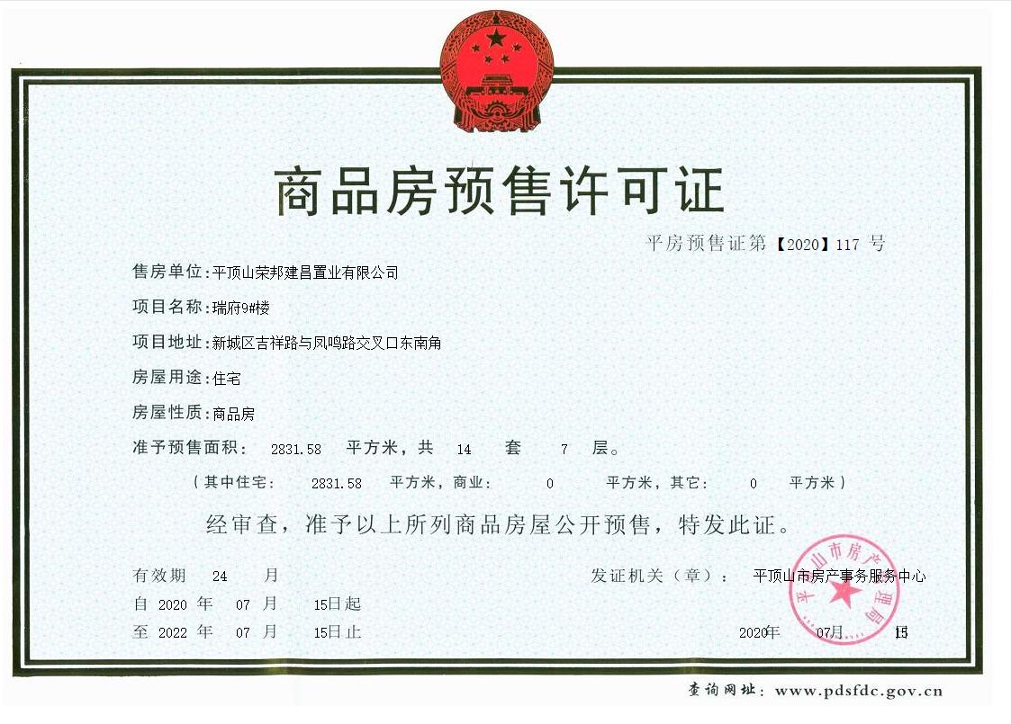 - 平房预售证第【2020】117号 详情发证时间 2020-07-15绑定楼栋瑞府9#楼证件照片