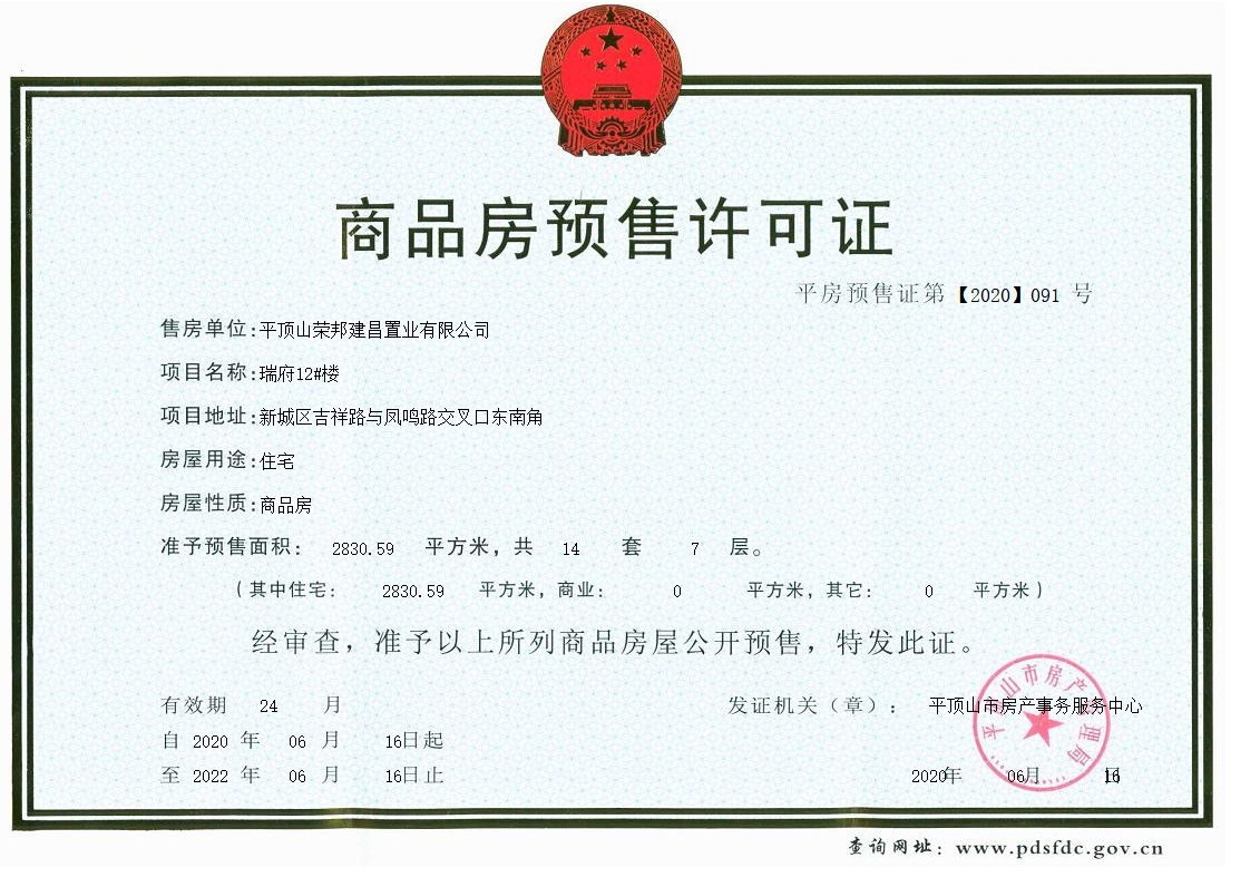 - 平房预售证第【2020】091号 详情发证时间 2020-06-16绑定楼栋瑞府12#楼证件照片