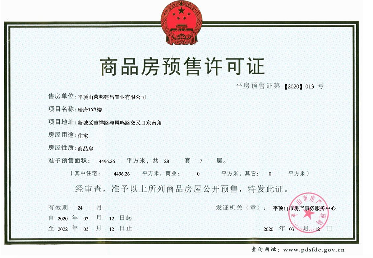 - 平房预售证第【2020】013号 详情发证时间 2020-03-12绑定楼栋瑞府16#楼证件照片