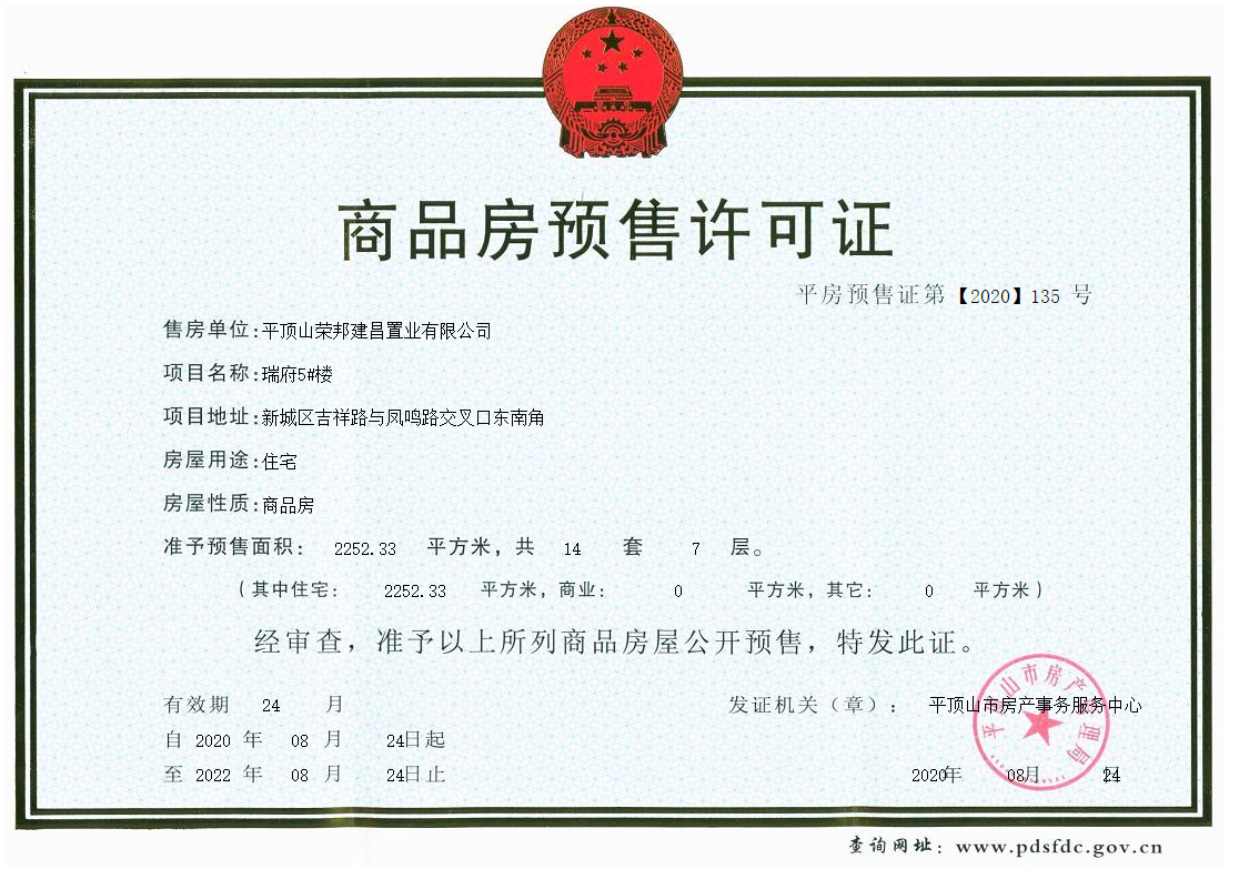 - 平房预售证第【2020】135号 详情发证时间 2020-08-24绑定楼栋瑞府5#楼证件照片