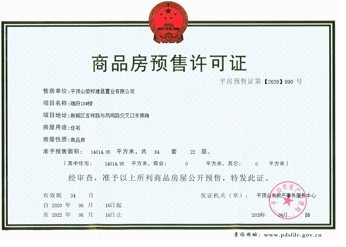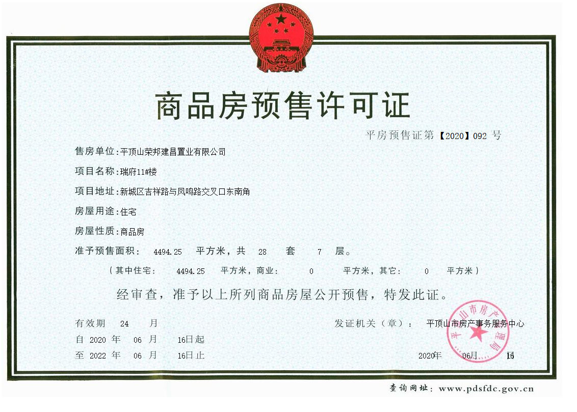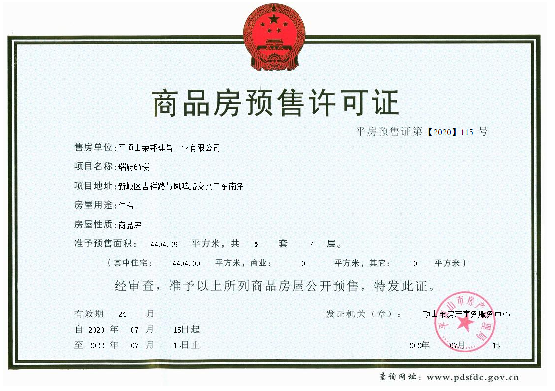 - 平房预售证第【2020】115号 详情发证时间 2020-07-15绑定楼栋瑞府6#楼证件照片