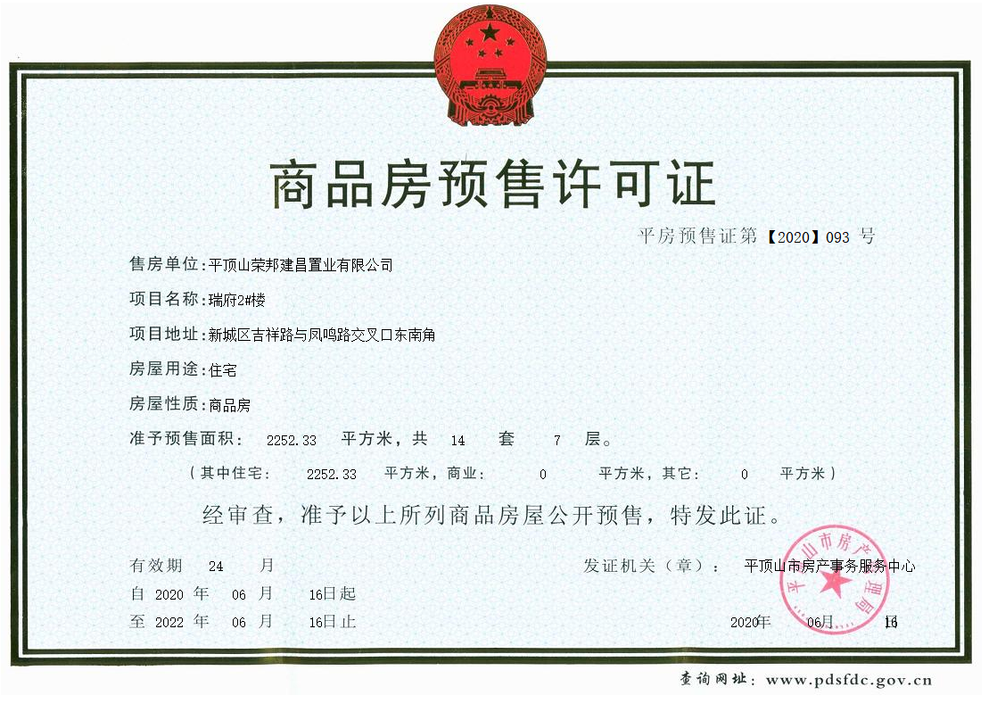 - 平房预售证第【2020】093号 详情发证时间 2020-06-16绑定楼栋瑞府2#楼证件照片